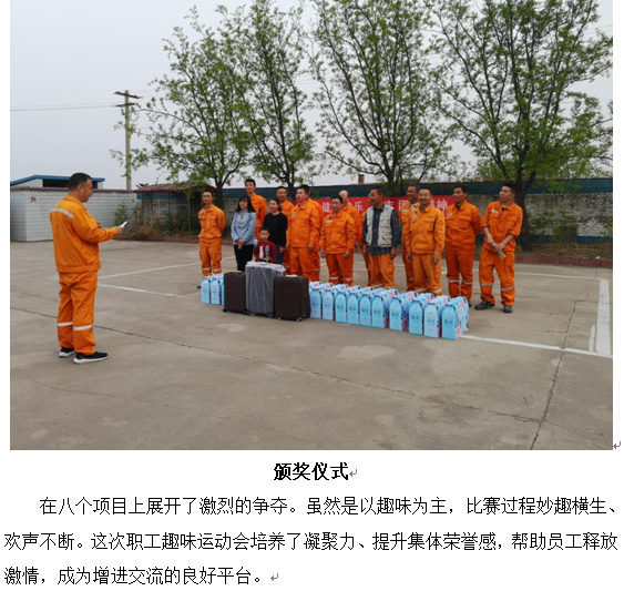 2019職工趣味運(yùn)動(dòng)會(huì) 為進(jìn)一步增強(qiáng)職工們的身體素質(zhì),豐富文體生活,增強(qiáng)凝聚力,在“五四”青年節(jié)來臨之際兗州文水分公司、呂梁分公司、中材文水分公司精心籌備,周密策劃的職工趣味運(yùn)動(dòng)會(huì),在兗州文水分公司生活區(qū)如期舉行。本次運(yùn)動(dòng)會(huì)的主題是“以促進(jìn)友誼為主,貴在人人參與,活躍公司氣氛”。以青年員工為主20多名干部職工參加了本次運(yùn)動(dòng)會(huì)。通過自?shī)首詷愤@種形式,增強(qiáng)團(tuán)隊(duì)合作精神,培養(yǎng)職工熱愛運(yùn)動(dòng),促進(jìn)身體健康,增強(qiáng)公司凝聚力、戰(zhàn)斗力、號(hào)召力的目的。5月6日下午,三個(gè)分公司的職工趣味運(yùn)動(dòng)會(huì),在經(jīng)理王建立宣讀比賽規(guī)則后拉開了帷幕。此次活動(dòng)由辦公室人員組織策劃,得到公司大力支持與全體員工的積極配合和參與。本次運(yùn)動(dòng)會(huì)共設(shè)有八個(gè)比賽項(xiàng)目: