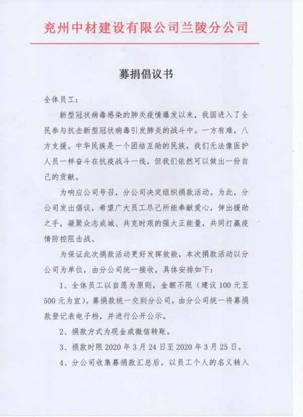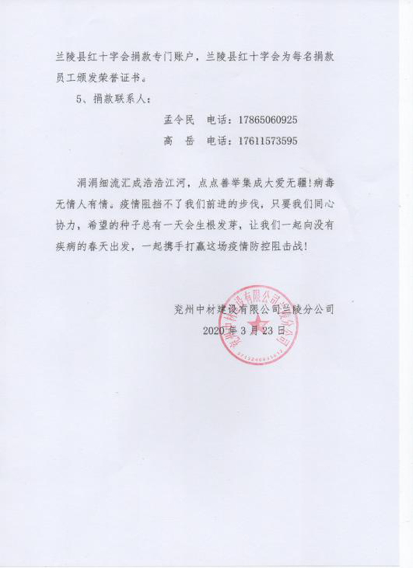陽春三月,乍暖還寒。全國疫情防控工作取得重大勝果接近尾聲之際,仍有很多人士奮斗在抗疫第一線。災害無情,人間有愛,近日來,蘭陵分公司積極響應公司號召,組織開展為防控新冠肺炎疫情捐款活動,助力新冠肺炎疫情防控工作。   蘭陵分公司下發(fā)了《募捐倡議書》,堅持自覺自愿與量力而行的原則,呼吁全體員工積極參與,奉獻愛心,捐款助力抗擊疫情。分公司經理龔士朋同志帶頭捐款,以實際行動做表率,起到很好的模范作用。在龔經理的帶動下,分公司全體員工積極響應,紛紛捐款,每一名員工都獻出一份愛心。  經過幾日的募捐,蘭陵分公司共籌集善款8000余元。3月25日,分公司安環(huán)科長孟令民同志,代表分公司將所籌善款轉交蘭陵縣紅十字會。紅十字會工作人員表示會將善款上交省紅十字會,全部用于新冠病毒疫情防控工作。并對捐款表示十分感謝,對此崇高的人道主義精神和奉獻愛心的善舉,表示誠摯的敬意。最后頒發(fā)給捐贈者榮譽證書。 涓涓細流匯成浩浩江河,點點善舉集成大愛無疆!病毒無情人有情。疫情阻擋不了我們前進的步伐,只要我們同心協(xié)力,希望的種子總有一天會生根發(fā)芽,讓我們一起向沒有疾病的春天出發(fā),一起攜手打贏這場疫情防控阻擊戰(zhàn)! |