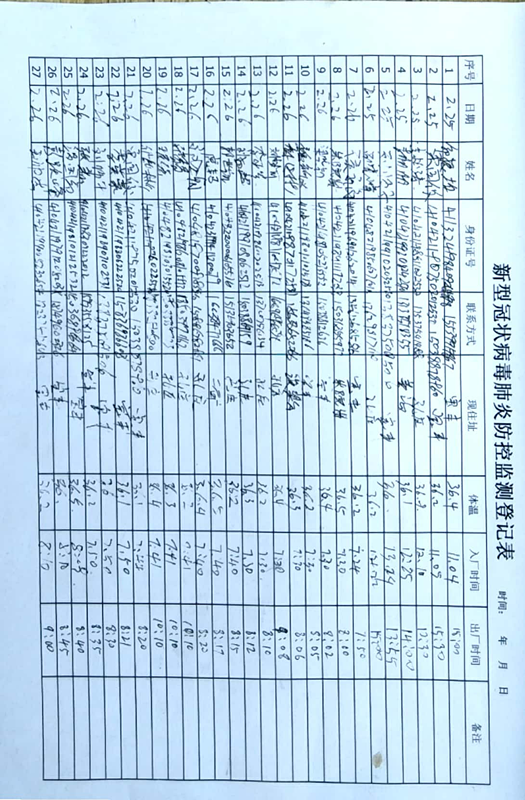 (3)體溫篩查。每天對當班人員進行兩次體溫篩查,上班前、下班前各一次,填寫記錄臺賬,并報送疫情防控領導小組。 (4)佩戴口罩。要求在崗員工必須主動佩戴口罩,掌握正確佩戴口罩的方法,隊伍不佩戴口罩人員,一律禁止進入辦公及生產(chǎn)場所,并進行嚴肅處理。 (5)分散就餐。返崗人員施行分散就餐,錯峰就餐制,嚴禁在食堂集中就餐。餐廳工作人員施行封閉式管理,吃住在生活區(qū),并安排專人到縣防控指揮部制定超市采購米、面、油、蔬菜等食材。 (6)開窗通風。辦公場所、生產(chǎn)車間、食堂等公共場所保持開窗通風,并對空調進行消毒。 (7)嚴格防疫物資領用。防疫物資根據(jù)按需領取的原則,嚴禁浪費。領用人按制度規(guī)定填寫領用臺賬。  (8)設立臨時隔離室。寶豐分公司在礦山上設立意見臨時隔離室,用于臨時出現(xiàn)發(fā)熱異常狀況的人員進行隔離。  (9)減產(chǎn)集聚。停止員工非必要集聚,盡量采取視頻會議、微信、電話等交流形式,最大限度減少集聚性的室內(nèi)活動。 (10)加強外來人員管理。對非本單位來訪人員從嚴控制,原則上不予入內(nèi)。確有來訪需求人員,須出示工作證或介紹信等有效證明,并由接訪人員派專人接待,并對來訪人員進行提問篩查,詳細登記個人信息。