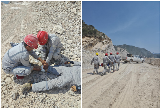 此次演練是模擬爆破后,爆破作業(yè)人員進(jìn)入爆破作業(yè)區(qū)域確定是否有無盲炮,由于爆破震動產(chǎn)生巖體松動,爆破作業(yè)人員躲閃不及被落石砸傷,導(dǎo)致無法起身。事故發(fā)生后,分公司立即上報(bào)并啟動放炮事故應(yīng)急預(yù)案,循序開展救援。