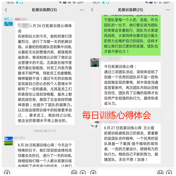 二、禮儀著裝與內(nèi)務(wù)整理 禮儀著裝和內(nèi)務(wù)不僅僅代表了個(gè)人的素質(zhì)與形象,更是一個(gè)集體精神面貌的體現(xiàn)。此次訓(xùn)練過后所有人的精神面貌都煥然一新,一改以前的無精打采,都變得精神抖擻;生活區(qū)的內(nèi)務(wù)也由“臟亂差”變成“潔凈美”,整個(gè)生活區(qū)都干干凈凈。 三、拓展訓(xùn)練 拓展訓(xùn)練旨在培養(yǎng)一個(gè)團(tuán)隊(duì)的凝聚力,核心指揮力,高效執(zhí)行力,團(tuán)隊(duì)協(xié)作力。 團(tuán)隊(duì)與團(tuán)隊(duì)之間競爭時(shí)候的拼勁,體現(xiàn)了大家強(qiáng)烈的集體榮譽(yù)感,雖然競爭有輸贏,但是我們看到了競爭中大家相互配合,相互鼓勵(lì),相互成長的過程,我想這應(yīng)該才是競爭真正的意義所在。 項(xiàng)目的成功與否,有許多環(huán)節(jié)―有效的工作方案、正確的團(tuán)隊(duì)指揮、高標(biāo)準(zhǔn)的執(zhí)行力、結(jié)果的及時(shí)反饋、經(jīng)驗(yàn)與教訓(xùn)的汲取等等這些因素都是成功必不可少的。 訓(xùn)練結(jié)束后,分公司經(jīng)理宋道明對(duì)三天的培訓(xùn)成果進(jìn)行了驗(yàn)收,肯定了此次培訓(xùn)的成果,并再次強(qiáng)調(diào)了訓(xùn)練的目的:希望通過此次培訓(xùn)來提升員工的綜合素質(zhì),工作執(zhí)行力;讓大家充分意識(shí)到相互溝通學(xué)習(xí)的重要性,從苦和累中學(xué)習(xí)體會(huì),從言談舉止中受益;培養(yǎng)嚴(yán)謹(jǐn)?shù)墓ぷ髯黠L(fēng)和認(rèn)真的學(xué)習(xí)態(tài)度,為工作中高標(biāo)準(zhǔn)、嚴(yán)要求打下堅(jiān)實(shí)的基礎(chǔ),為企業(yè)的長遠(yuǎn)發(fā)展貢獻(xiàn)一份力量。訓(xùn)練雖然結(jié)束了,但是挑戰(zhàn)才剛剛開始,我們?cè)谝院蟮墓ぷ骱蜕钪?,要將此次?xùn)練的標(biāo)準(zhǔn)作為今后的準(zhǔn)則,要持之以恒的堅(jiān)持下去,為企業(yè)的發(fā)展貢獻(xiàn)我們自己的一份力量。