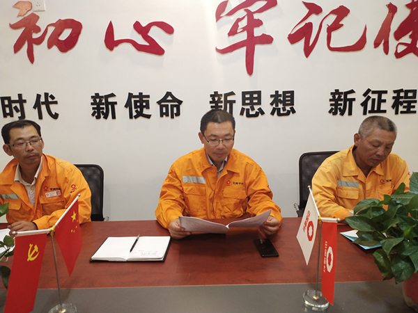 按上級黨委統(tǒng)一部署,寧陽項(xiàng)目部于9月23日晚召開全體員工結(jié)合中材礦山劉書記講話精神,開展“不忘初心,牢記使命”主題教育活動(dòng)。 會(huì)上,劉經(jīng)理首先帶領(lǐng)全體員工認(rèn)真學(xué)習(xí)《在中材礦山建設(shè)有限公司開展“不忘初心,牢記使命”主題教育部署會(huì)上的講話》。全體員工分別針對“不忘初心,牢記使命”主題教育活動(dòng)展開發(fā)言討論。最后,根據(jù)《在中材礦山建設(shè)有限公司開展“不忘初心,牢記使命”主題教育部署會(huì)上的講話》會(huì)議精神,劉經(jīng)理呼吁全體員工要積極努力地向黨靠攏,今后更加緊密團(tuán)結(jié)在以習(xí)近平同志為核心的黨中央周圍,高舉習(xí)近平新時(shí)代中國特色社會(huì)主義思想偉大旗幟,扎實(shí)做好“不忘初心,牢記使命”主題教育工作,為全面完成集團(tuán)和股份公司下達(dá)的各項(xiàng)經(jīng)濟(jì)指標(biāo)而努力奮斗,以優(yōu)異的成績迎接新中國成立70周年   |