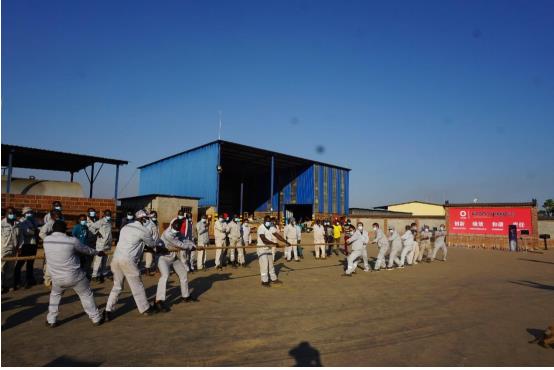 舉行以各生產(chǎn)部門(mén)為團(tuán)隊(duì)的拔河比賽,圖片為中方員工組成團(tuán)隊(duì)與贊方員工比賽圖。